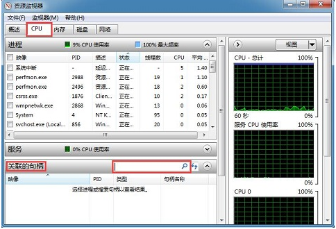 3.進(jìn)入到資源監(jiān)視器窗口之后,咱們切換到CPU這一欄,然后點(diǎn)擊關(guān)聯(lián)的句柄后的下拉箭頭,然后在搜索欄中輸入文件的名字,也就是咱們無(wú)法關(guān)閉掉的文件的名字,然后單擊回車。