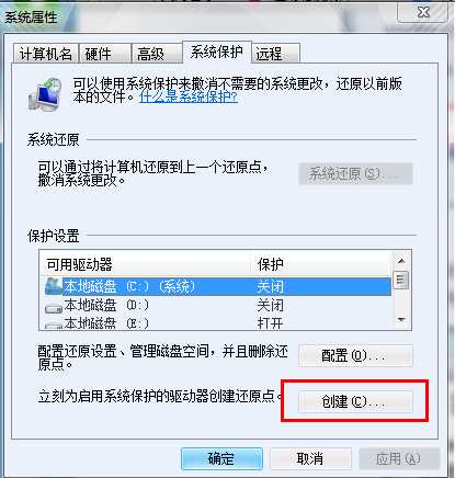 3:在系統(tǒng)保護(hù)選項(xiàng)卡下,選中你要?jiǎng)?chuàng)建的磁盤(C盤是系統(tǒng)),然后點(diǎn)擊“創(chuàng)建”按鈕;