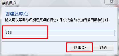 4、在跳出的“系統(tǒng)保護(hù)”框中填寫還原點(diǎn)的名稱以及描述,系統(tǒng)會(huì)自動(dòng)添加當(dāng)前日期和時(shí)間,如圖2和圖3所示: