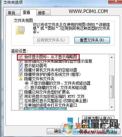 有的朋友可能是文件夾中的存放的視頻或音頻文件過(guò)多,打開(kāi)文件夾時(shí)win7會(huì)預(yù)覽文件,從而導(dǎo)致一瞬間CPU利用率過(guò)高,然后explorer停止 工作。解決方法就是關(guān)閉縮略圖功能,操作方法計(jì)算機(jī)--組織---文件夾選項(xiàng)---查看,勾選始終顯示圖標(biāo),從不顯示縮略圖,取消以縮略圖形式顯示文件圖 標(biāo)即可。
