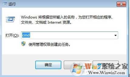 1、首先在桌面按下“Win + R”快捷鍵打開“運行”窗口,輸入“cmd”并點擊確定打開命令提示符;