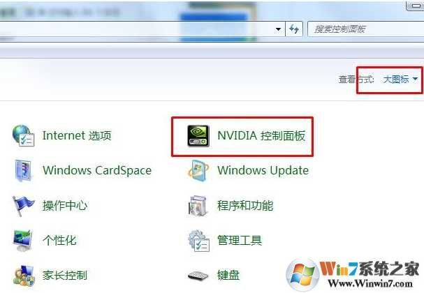 2、在打開的窗口右上角的“查看方式”選擇大圖標(biāo)。然后就可以找到“NVIDIA控制面板”。如果控制面板中都不顯示NVIDIA控制面板,那么需要重新安裝顯卡驅(qū)動(dòng)程序來(lái)解決。