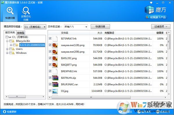3、因?yàn)榛厥照疚募荚贑盤(系統(tǒng)盤)中,我們在這里選擇恢復(fù)C盤文件,選擇好之后,點(diǎn)擊『快速掃描』,然后就可以在$Recycle.Bin文件夾下找到回收站被清空的文件。如下圖所示。