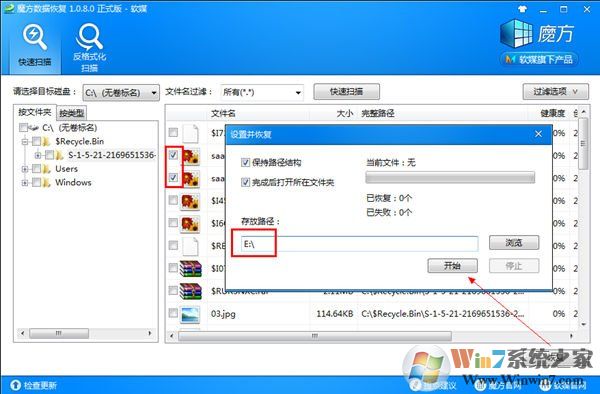 4、在魔方數(shù)據(jù)恢復(fù)掃描出的回收站清空文件后,查找你自己誤刪需要恢復(fù)的文件,在前面打勾。之后點(diǎn)擊『恢復(fù)』,并選擇恢復(fù)文件保存的路徑,就可以了。