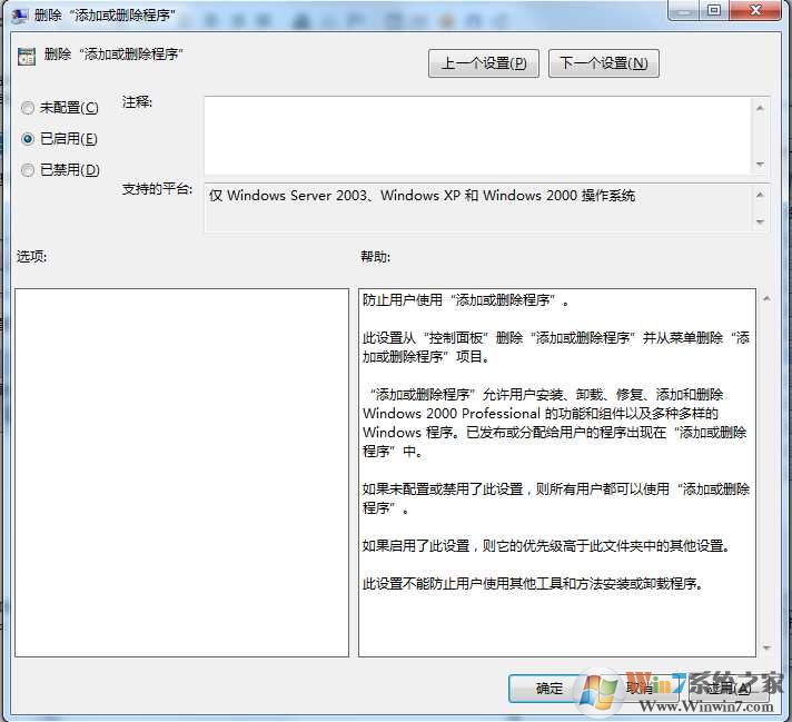 3、雙擊“刪除‘添加/刪除程序’程序”項(xiàng),在彈出窗口中勾選“啟用”即可