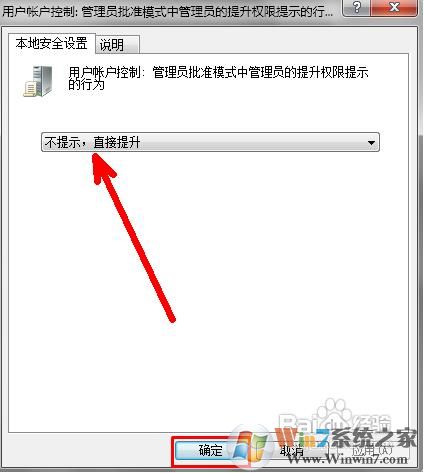 4、這時你需要選擇不提示,直接提升,就是點擊右邊的下拉箭頭之后,找到這樣一個選項。然后點擊確定即可。
