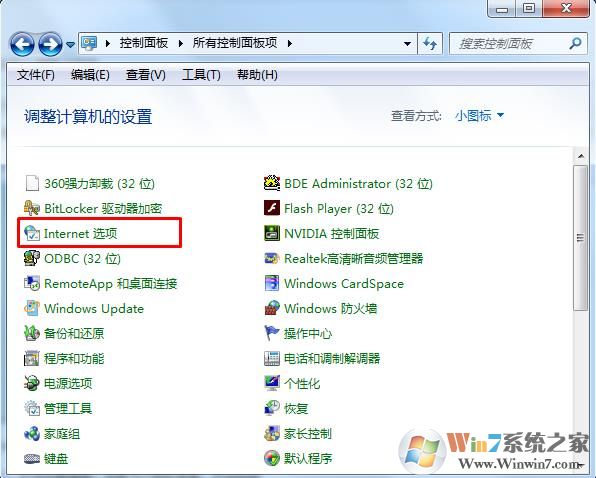 1、打開控制面板,設(shè)置為小圖標(biāo)查看,然后找到 Internet選項(xiàng)并打開。