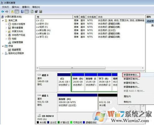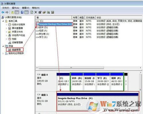 3、點擊“磁盤管理”,然后你就會看到移動硬盤的信息,移動硬盤默認(rèn)只有一個分區(qū)(通常移動硬盤是磁盤1 大家根據(jù)容量可以判斷哪個是移動硬盤)