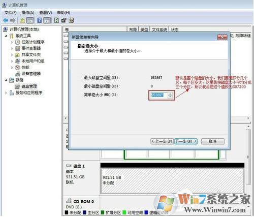 6、然后就是要輸入分區(qū)的大小了,根據(jù)自己總硬盤大小,設(shè)置一個合適的大小,如1000G的硬盤,你想分配為三個區(qū),那么每個大小分配為300000M左右,然后下一步;