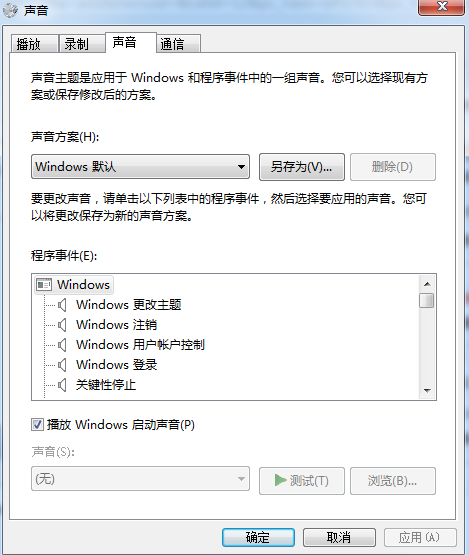 2、最上面菜單欄選擇聲音、你會發(fā)現(xiàn)系統(tǒng)最下方的聲音選項時沒有顯示的,這是我們就可以選擇程序事件中的windows登陸
