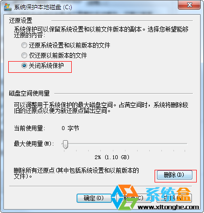 3、保護(hù)功能關(guān)閉后,我們還要將原來創(chuàng)建的還原點全部刪除,如下圖: