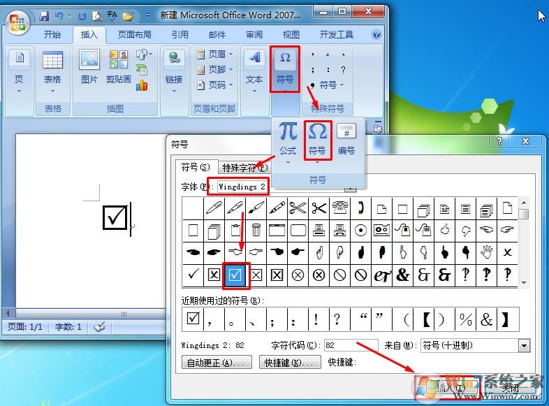 2、繼續(xù)選擇符號,然后把字體設置為wingdings 2 ,這時下方就可以找到方框內(nèi)打鉤符號了。