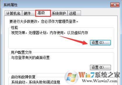 4、再然后在彈出的窗口中選擇“高級”,然后點擊“性能”一欄中的“設置”按鈕。