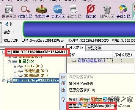 5、當(dāng)然,我們也可以利用“DiskGenius分區(qū)工具”對(duì)引導(dǎo)分區(qū)進(jìn)行修復(fù)。在其程序主界面中,右擊要修復(fù)的分區(qū),從彈出的右鍵菜單中選擇“重建主引導(dǎo)記錄”項(xiàng)進(jìn)行修復(fù)。