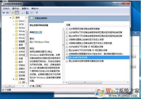 2、打開組策略編輯器,找到本地組策略編輯器,選擇計(jì)算機(jī)配置---管理模板---系統(tǒng)---設(shè)備安裝---設(shè)備安裝限止項(xiàng),在右邊就可以設(shè)置:禁止安裝可移動(dòng)設(shè)備,如圖: