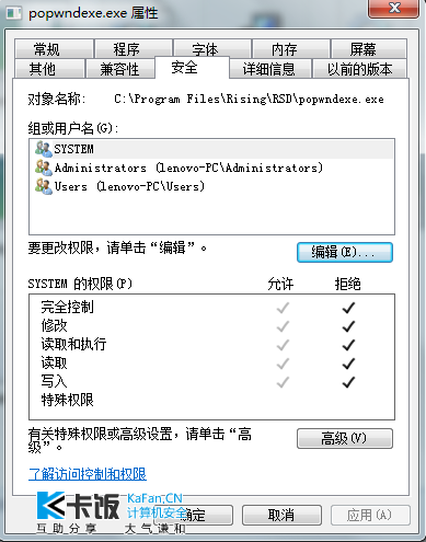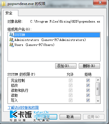 然后進(jìn)入C:\Program Files\Rising\RSD這個(gè)文件夾,刪除popwndexe.exe,再建立一個(gè)同名文件,后綴名仍然是exe(大家應(yīng)該知道吧,不知道的話自己百度哦)。在屬性中將權(quán)限全部修改為拒絕,保險(xiǎn)起見,將全部用戶都設(shè)置為拒絕(瑞星每次升級(jí)都會(huì)自動(dòng)校驗(yàn)文件完整性,如果不修改的話,瑞星升級(jí)會(huì)自動(dòng)下載并替換這個(gè)文件),保存后再打開自我保護(hù)。