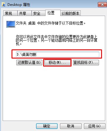 4、點擊位置頁面中的【移動(M)】按鈕,并且瀏覽到你剛才創(chuàng)建的D:\桌面 文件夾,并且點擊確定,之的系統(tǒng)會彈出是否要把桌面移動至新文件夾的提示,我們直接點是,視文件多少等待幾分鐘后,桌面就移動至新的文件夾了。