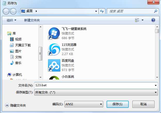 3、另存名字為123.bat,文件類型為所有文件