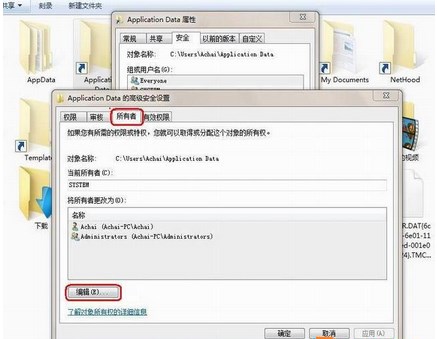 2、在高級安全設(shè)置頁,我們點(diǎn)擊所有者選項(xiàng)卡標(biāo)簽,此時我們可以看到該文件所有者是"SYSTEM",我們點(diǎn)擊編輯按鈕;