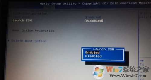 2、繼續(xù)通過(guò)菜單選項(xiàng)卡“Boot”菜單,選擇“Launch CSM”默認(rèn)選項(xiàng)是“Disabled”,選中回車(chē)這里我們將選擇“Enabled”。