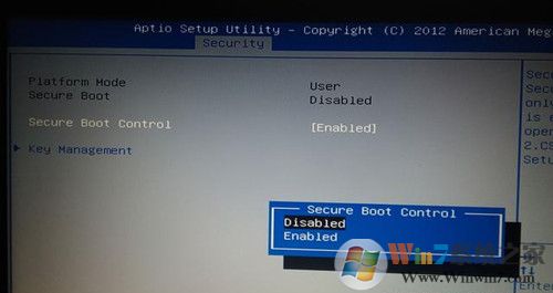 1、開(kāi)機(jī)進(jìn)入BIOS界面之后,用方向鍵選擇“security”菜單然后選擇“Secure Boot Control”回車(chē),默認(rèn)選項(xiàng)是“Enabled”,這里我們將選擇“Disabled”。
