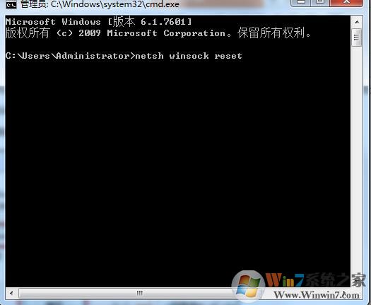 2、然后在命令提示符下輸入 “netsh winsock reset”命令并回車,等待片刻即可重置網(wǎng)絡(luò)