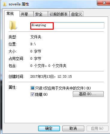 3、這時(shí)候我們?cè)俅蜷_dianying文件夾屬性,可以看到隱藏選項(xiàng)已經(jīng)可用了,那么我們就可以大大方方的給他設(shè)置了。