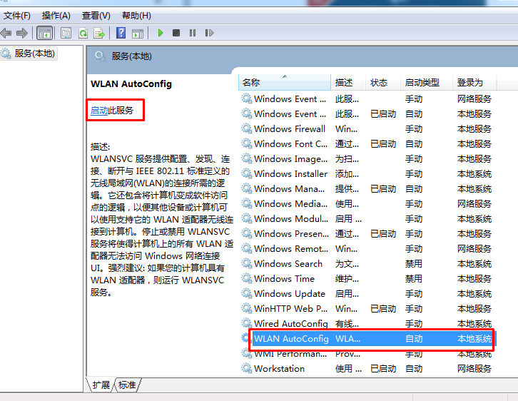 2、在本地服務(wù)列表里找到WLAN AutoConfig 服務(wù),這時(shí)我們看到它沒有啟動(dòng);