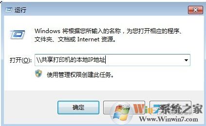 4、進行測試,找一臺在同一局域網(wǎng)內(nèi)的計算機,快捷鍵Windows鍵+R, 打開“運行”對話框,或者直接開始菜單點擊運行,在運行對話框中輸入共享打印機的本地IP地址: