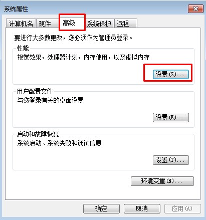3、然后我們點(diǎn)擊“高級(jí)”標(biāo)簽轉(zhuǎn)到高級(jí)選項(xiàng)卡,并點(diǎn)擊性能區(qū)域的“設(shè)置”按鈕;