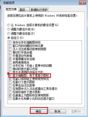 4、性能選項(xiàng)的“視覺(jué)效果”頁(yè)面,下方的自定義列表中找到“顯示縮略圖,而不是顯示圖標(biāo)”條目,把這條選項(xiàng)勾選,并點(diǎn)擊應(yīng)用,然后確定退出。
