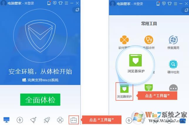 1、打開電腦管家 – 點(diǎn)擊“工具箱” – 點(diǎn)擊“瀏覽器保護(hù)”。