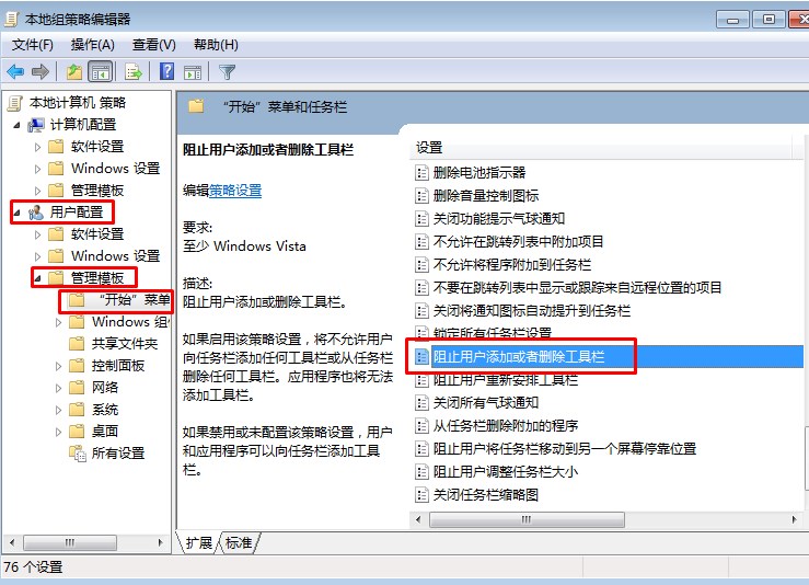 2、這時(shí)會(huì)打開策略組編輯器,我們從【用戶配置】下,展開【管理模板】,然后選中【開始菜單和任務(wù)欄】;這時(shí)我們可以在右側(cè)窗口中找到“阻止用戶添加或刪除工具欄”選項(xiàng)