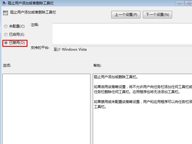 3、雙擊“阻止用戶添加或刪除工具欄”選項(xiàng),雙擊打開,設(shè)置為“已禁用”,然后應(yīng)用保存;