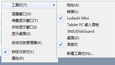 4、這時(shí)我們再右鍵點(diǎn)擊任務(wù)欄查看“工具欄“選項(xiàng)時(shí)就會(huì)發(fā)現(xiàn),子菜單都變?yōu)榭蛇x狀態(tài)了,鎖定到任務(wù)欄也變得可用了。