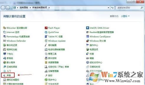 1、單擊“開始”菜單,單擊“控制面板”項,單擊“聲音”項。