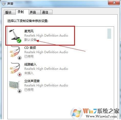 3、切換到“錄制”選項卡,看看麥克風是否被設(shè)置為默認設(shè)備(注:有的聲卡可能會顯示多個麥克風選項)。