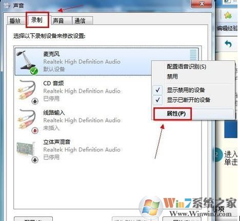 2、進入“聲音”對話框,切換到“錄制”選項卡,直接雙擊“麥克風”選項或鼠標右鍵單擊“屬性”命令。
