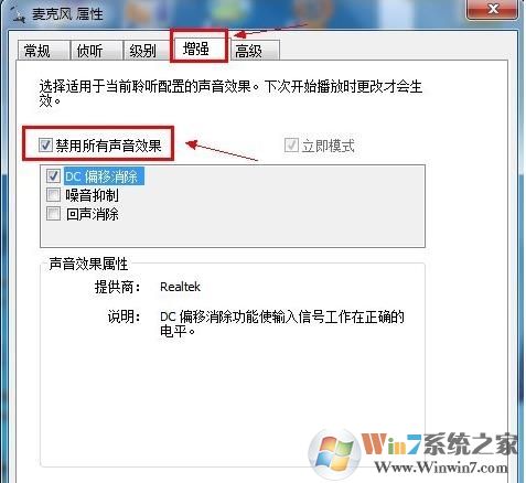 2在“麥克風屬性”窗口切換到“增強”選項卡,然后勾選“禁用所有聲音效果”復(fù)選框,最后單擊“確定”按鈕保存修改。