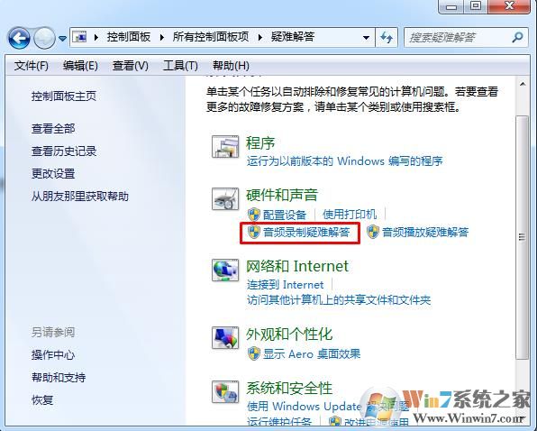 1、首先將耳機插入計算機的麥克風插口或是USB口,然后單擊“開始”菜單,單擊“控制面板”項,單擊“疑難解答”項,單擊“硬件和聲音”欄下的“音頻錄制疑難解答”;
