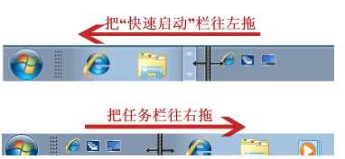 4、我們把快速啟動(dòng)欄往左拖到不能再拖的位置。然后把任務(wù)欄往右拖,快速啟動(dòng)欄就移動(dòng)到了最左邊;