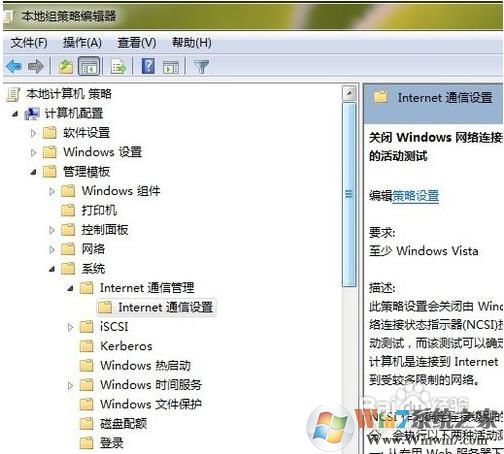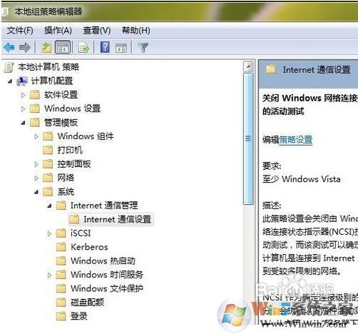 4.依次展開“計(jì)算機(jī)配置”、“管理模板”、“系統(tǒng)”和“Internet 通信管理”,然后我們單擊“Internet 通信設(shè)置”。在列表中找到“關(guān)閉 Windows 網(wǎng)絡(luò)連接狀態(tài)指示器活動(dòng)測(cè)試”并雙擊,然后單擊“已啟用”(默認(rèn)未配置)。