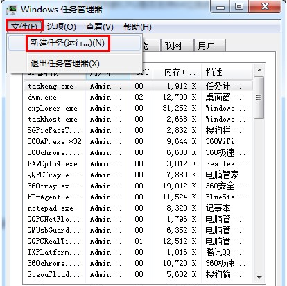4.按下鍵盤上的Ctrl+Shift+Del組合鍵,打開Windows任務管理器,點擊“文件”“新建任務(運行...)(N)”。