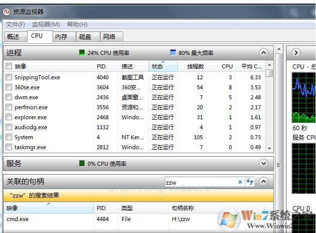 3:選擇“CPU”,在下部可以看到“關(guān)聯(lián)的句柄”搜索框
