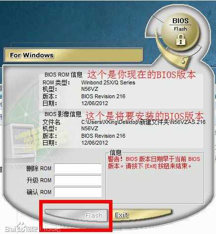 8、然后在新窗口上會(huì)顯示出你現(xiàn)在的BIOS版本和將要安裝的BIOS版本。點(diǎn)擊下側(cè)的Flash安裝BIOS。(安裝BIOS時(shí)盡量不要?jiǎng)与娔X。而且安裝完以后會(huì)立刻關(guān)機(jī),所以請(qǐng)?jiān)诳赐瓯窘坛毯笤匍_(kāi)始哦,因?yàn)檫€有BIOS要設(shè)置的)。
