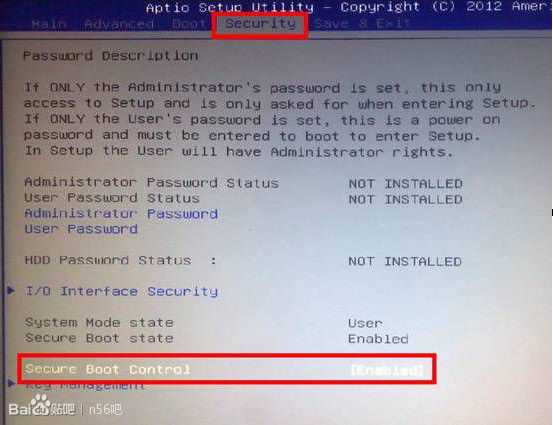 如果開(kāi)機(jī)不會(huì)自動(dòng)進(jìn)入系統(tǒng),而是直接進(jìn)入BIOS界面。那么現(xiàn)在要開(kāi)始設(shè)置一下BIOS了。先切換到Security選項(xiàng)卡,關(guān)掉Secure Boot Control這個(gè)選項(xiàng)。