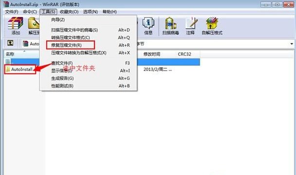 1、在需要修復(fù)的winRAR文件上雙擊,在打開的窗口中選中需要修復(fù)的文件夾,選擇“工具”—“修復(fù)壓縮文件”命令。