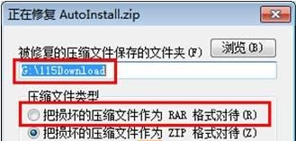 2、此時會彈出“正在修復(fù)”窗口.選擇保存的位置,并選中“把損壞的壓縮文件作為RAR格式對待”的單選按鈕,點擊“確定”按鈕進行修復(fù)。