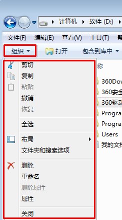 文件夾工具在哪里呢,打開任意一個文件夾左上角找到組織2個字樣,點開就是文件夾工具了,上面有復(fù)制黏貼刪除等我們常用的工具,如下圖所示