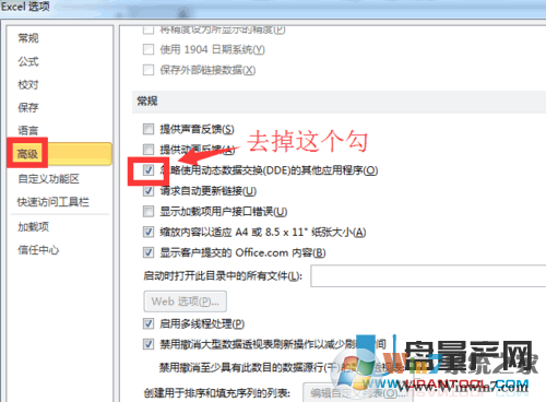 2、如下圖,點擊高級選項,然后去掉“忽略使用動態(tài)數(shù)據(jù)交換(DDE)的其他應用程序”